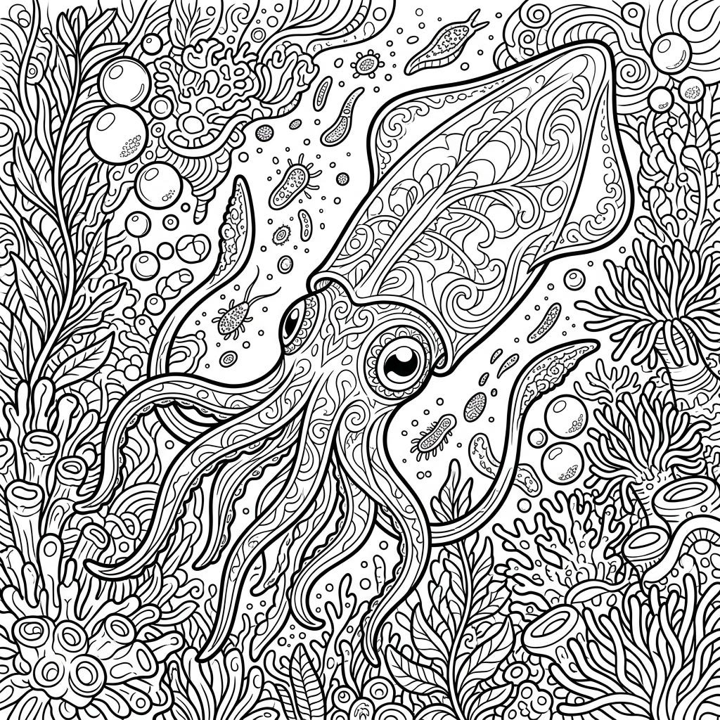 View coloring pageUncover the mysteries of the deep ocean with this intricate full scene coloring page featuring a magnificent glass squid. Engage your creativity as you bring to life an underwater world filled with unique marine creatures and detailed coral reefs.