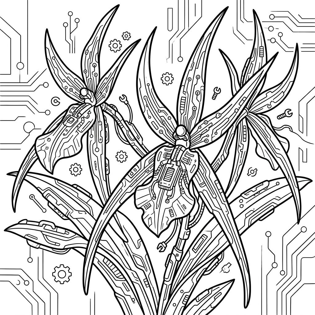 Step into a world where nature meets technology with this captivating Brassia Orchids coloring page, reimagined through a cyberpunk lens. Immerse yourself in intricate circuit patterns and robotic details as you bring this unique sci-fi floral art to life.