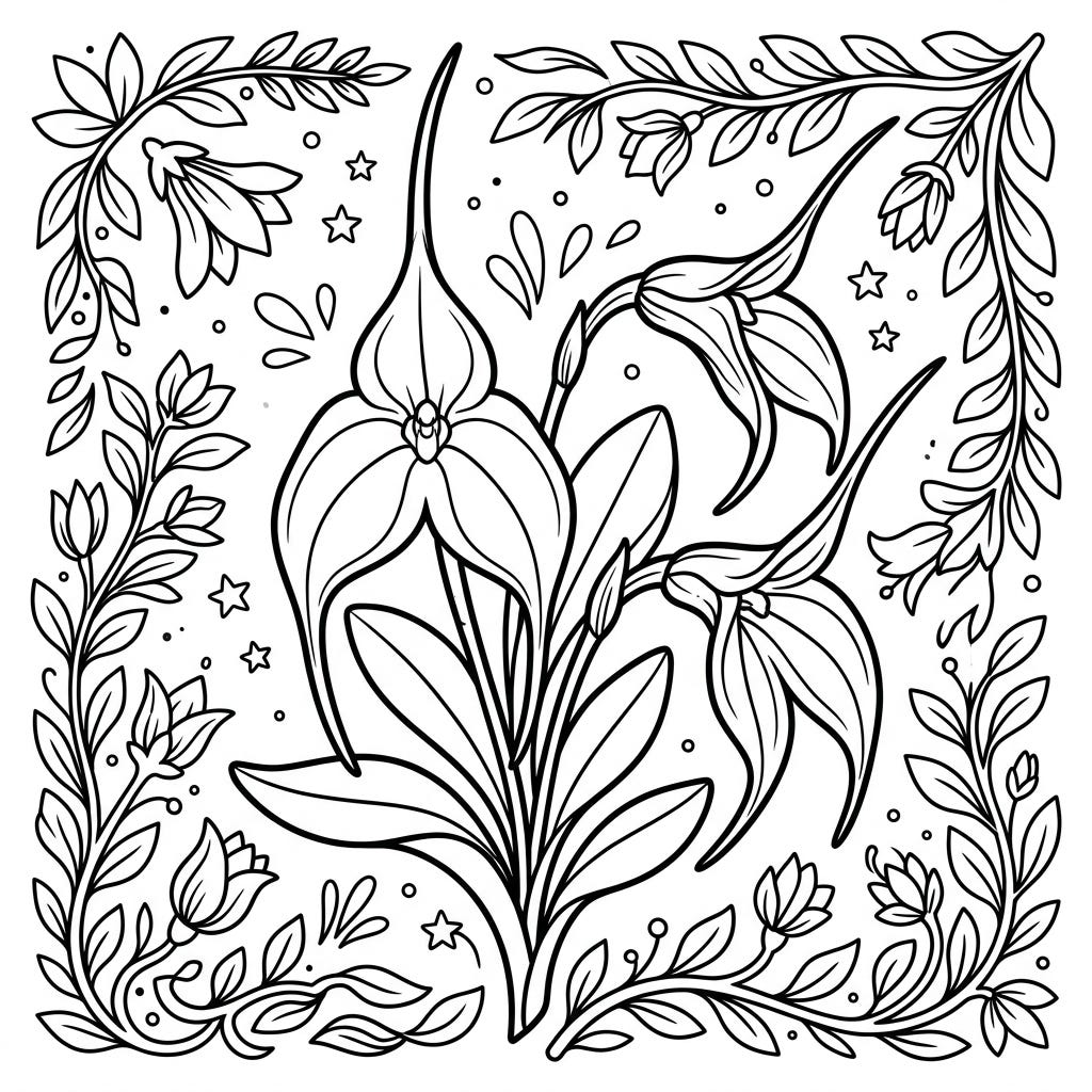 View coloring pageDiscover the exquisite beauty of Masdevallia orchids blooming unexpectedly amidst a serene winter wonderland. This enchanting coloring page combines intricate floral details with delicate snowflakes for a truly captivating artistic journey.