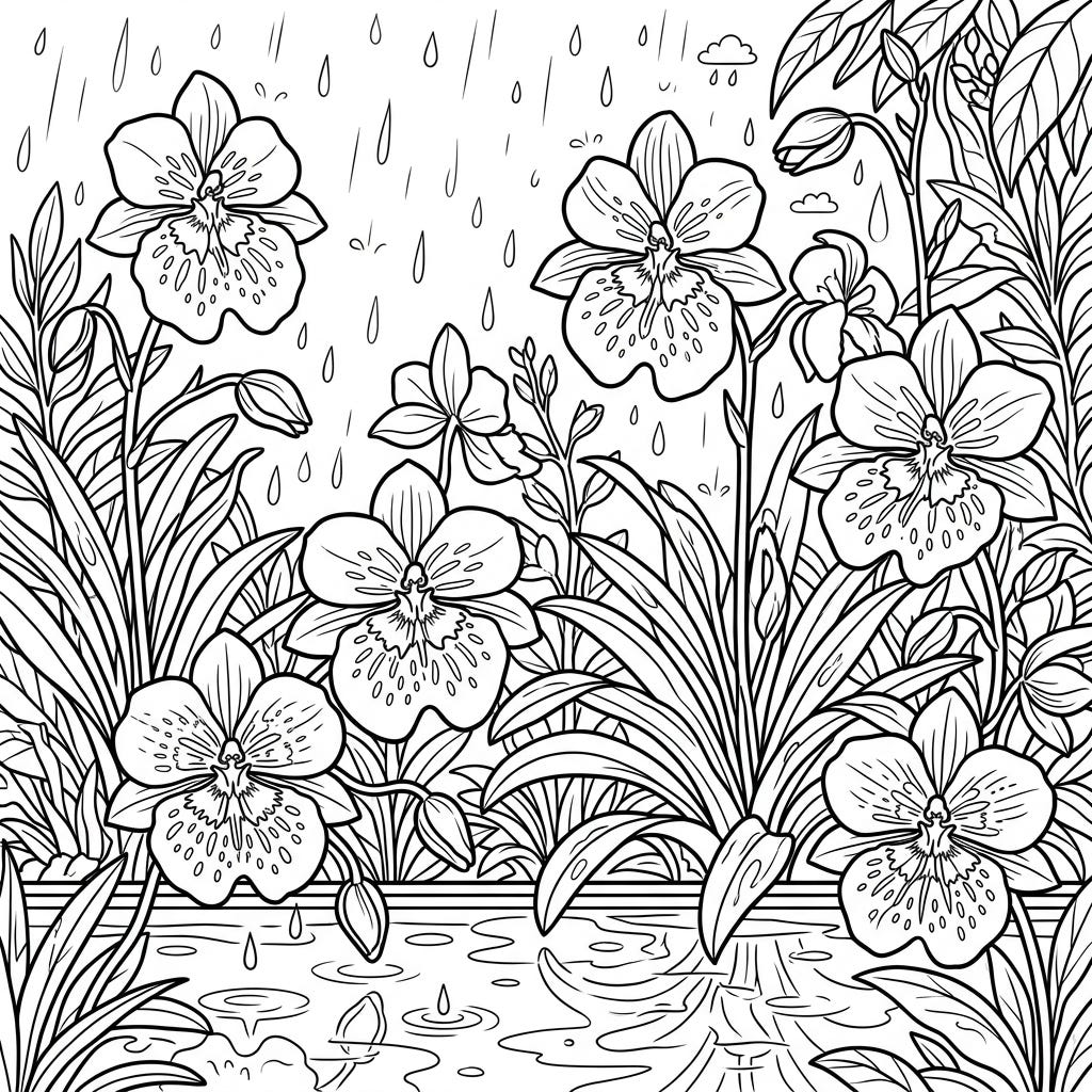 Unwind with this beautiful coloring page featuring elegant Miltonia Orchids flourishing during a gentle rainy day. Discover the calming beauty of 'Pansy Orchids' as raindrops dance around them and reflect on wet surfaces.