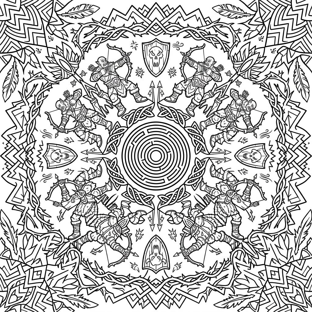 Journey into a fantastical realm with this mesmerizing Orc Archer Mandala coloring page, featuring fierce warriors in a beautifully symmetrical design. Perfect for fantasy art enthusiasts looking for an engaging and intricate coloring challenge.