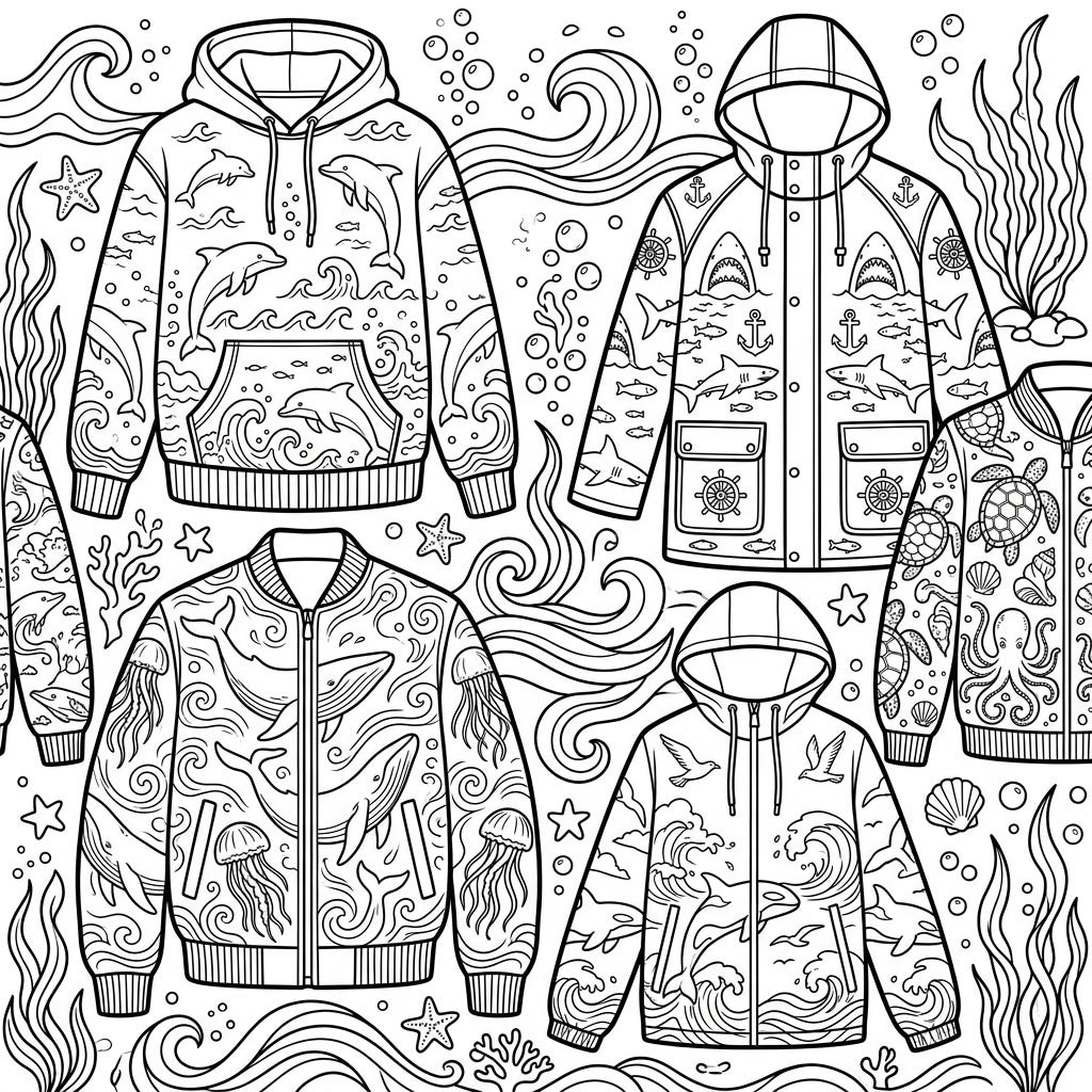 Explore a unique collection of outerwear designs, each adorned with captivating marine life like playful dolphins, majestic whales, and fearsome sharks. This intricate coloring page invites you to bring a vibrant ocean wardrobe to life with your favorite hues.