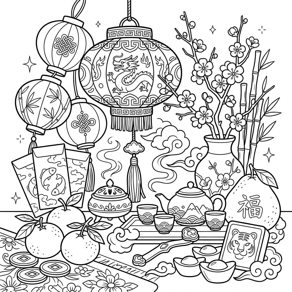 Dive into the rich traditions of Lunar New Year with this beautiful still life coloring page. It features an array of symbolic items, perfect for a cozy and meaningful coloring session.