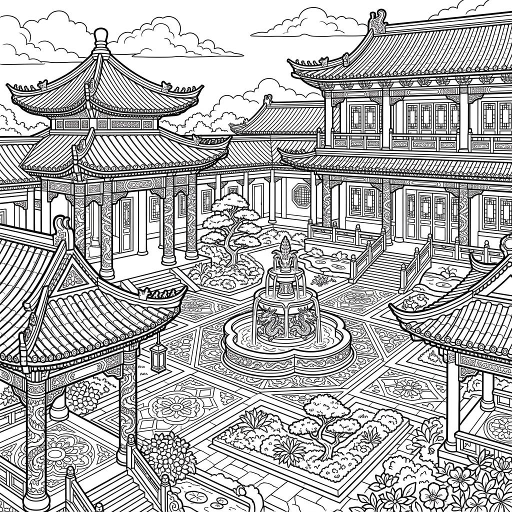 Step into a world of ancient beauty with this intricate palace courtyard coloring page. Discover grand architectural details, serene gardens, and a majestic dragon fountain awaiting your creative touch.