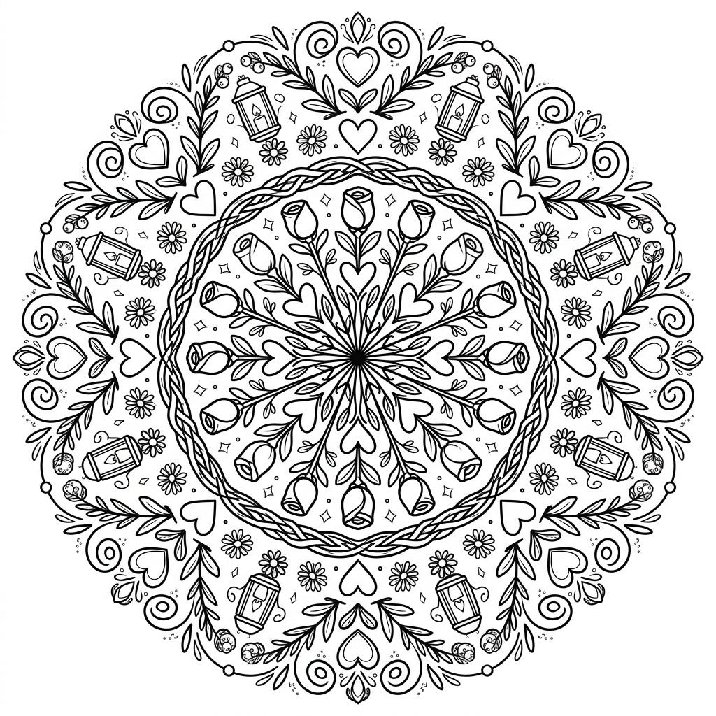 Unwind with this beautiful Cottagecore mandala, perfect for celebrating Mother's Day. Its intricate patterns, delicate roses, and charming hearts offer a delightful and meditative coloring experience.
