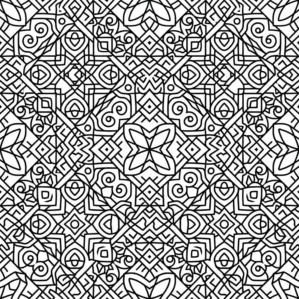 Immerse yourself in the mesmerizing world of abstract geometric patterns with this intricate coloring page. Featuring a complex tapestry of lines, shapes, and swirls, it offers a deeply satisfying and meditative coloring experience.