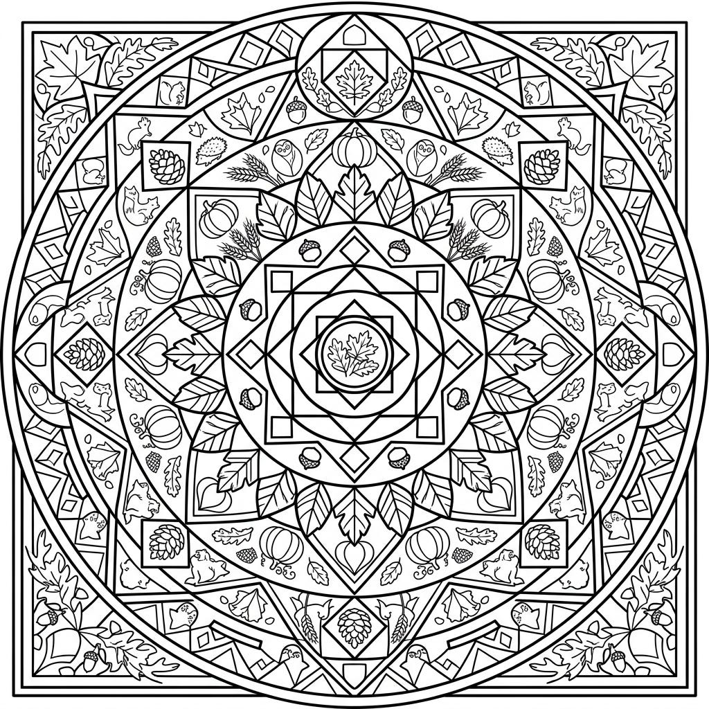 Celebrate the vibrant spirit of autumn with this stunning geometric mandala. Its intricate patterns are beautifully intertwined with fall leaves, pumpkins, and charming woodland creatures, offering a unique coloring experience.