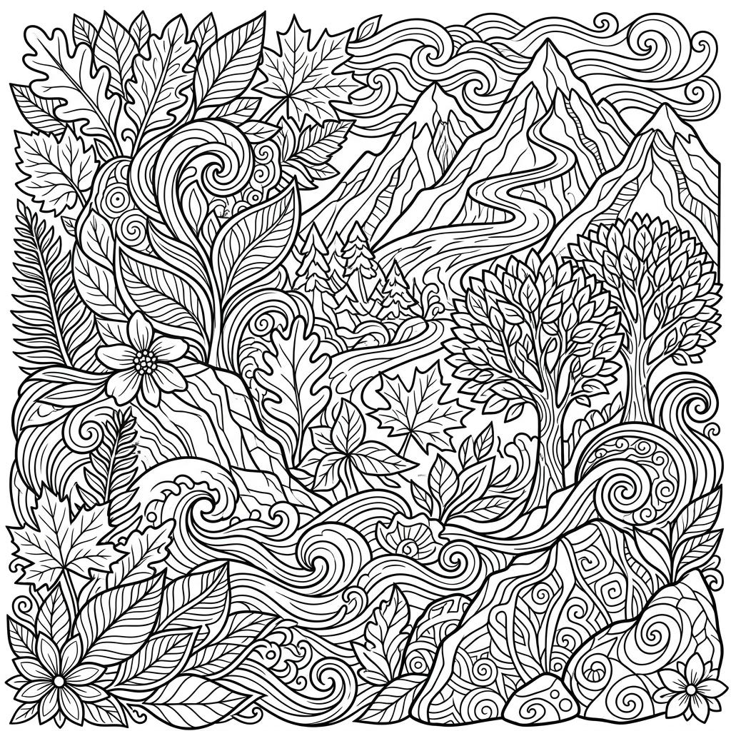 Unleash your creativity with this intricate nature-inspired patterns coloring page. Dive into a detailed world of mountains, rivers, and lush foliage, perfect for a mindful coloring journey.