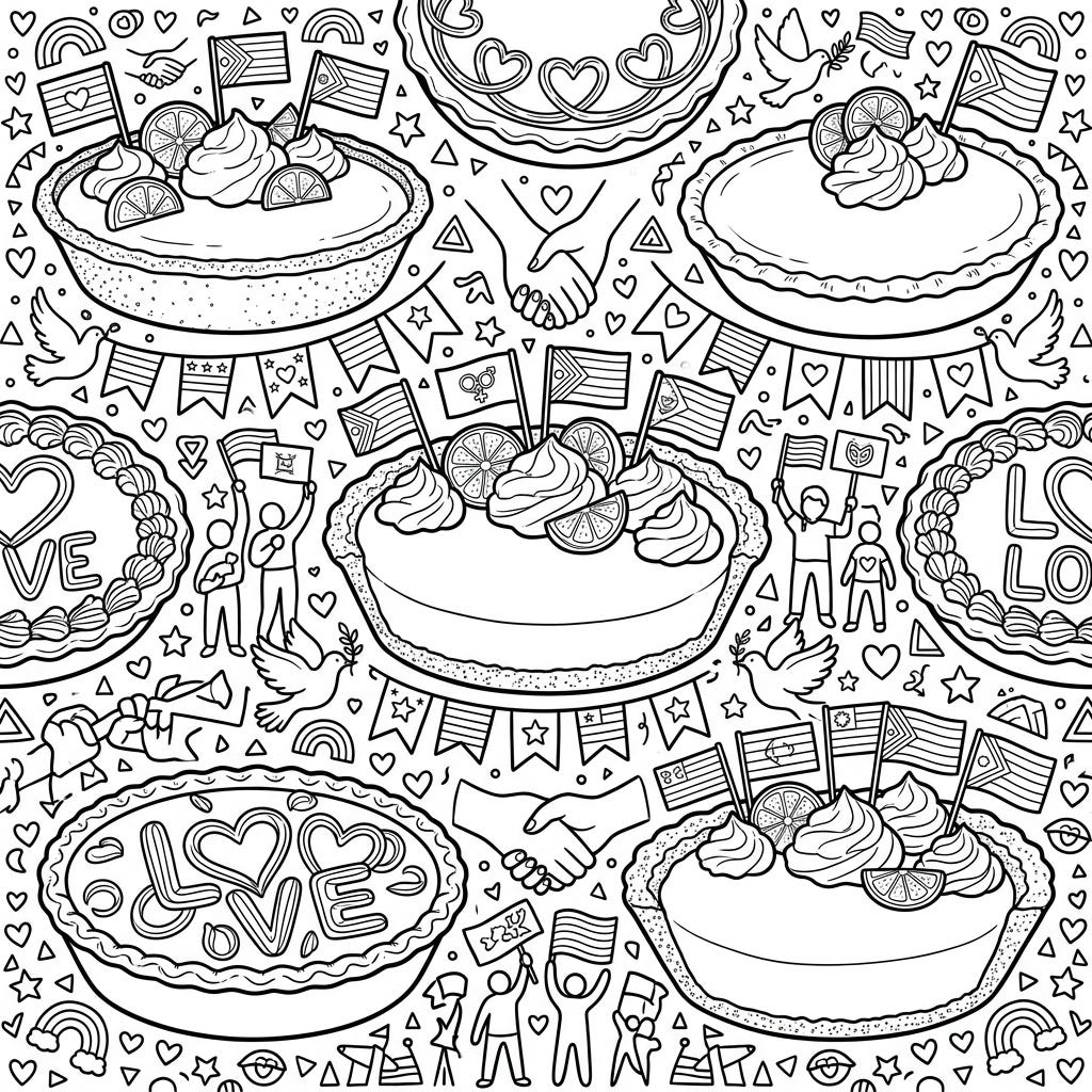 View coloring pageDive into a vibrant celebration with our Key Lime Pie Pride coloring page, blending delicious desserts with heartfelt symbols of love and community. This intricate design invites you to express your creativity and joy for Pride Month.