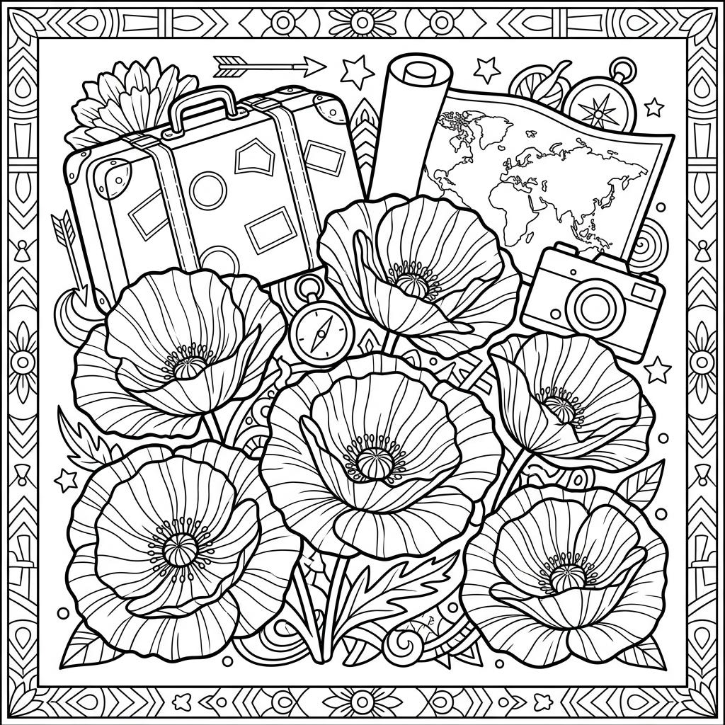 View coloring pageCelebrate the joy of travel and the beauty of nature with this unique coloring page. Featuring elegant crinkled poppies intertwined with adventurous vacation elements, it's perfect for a relaxing artistic escape.