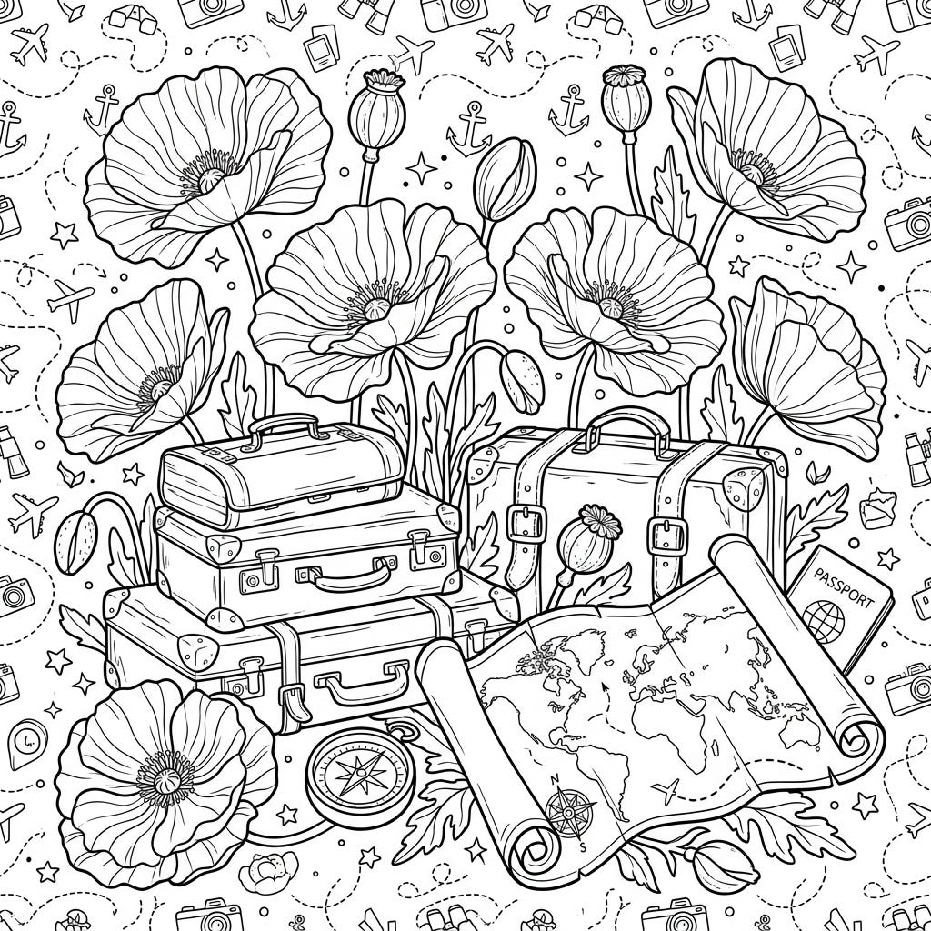 Prepare for a delightful coloring adventure where the delicate beauty of Iceland poppies meets the excitement of vacation travel. This unique design features iconic travel elements intertwined with beautiful floral arrangements, perfect for inspiring your next journey.