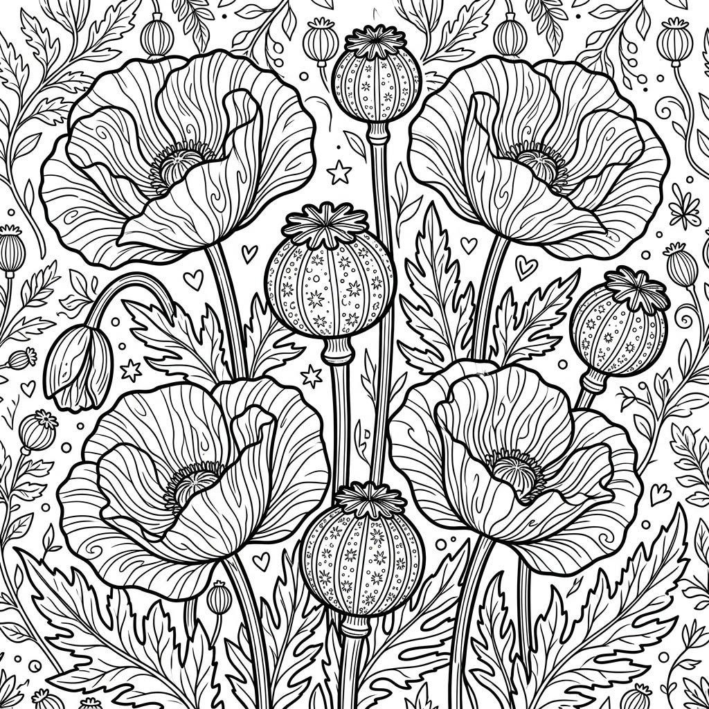 View coloring pageExplore our collection of Opium Poppies coloring pages, featuring detailed illustrations. Discover the unique globe-shaped seed pods and beautiful blooms of these fascinating flowers.