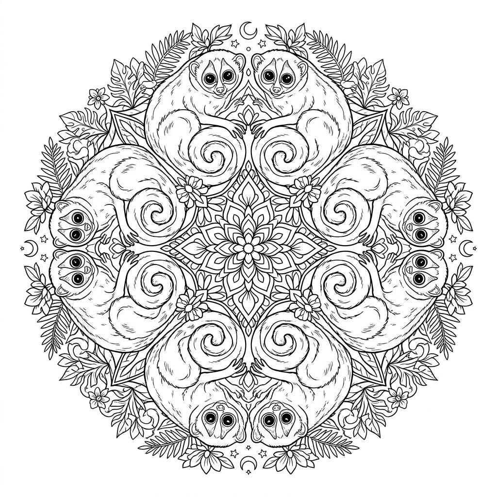 Dive into a world of intricate beauty with this captivating lorises mandala coloring page, designed specifically for teens. Explore symmetrical patterns featuring adorable lorises amidst detailed botanical elements.