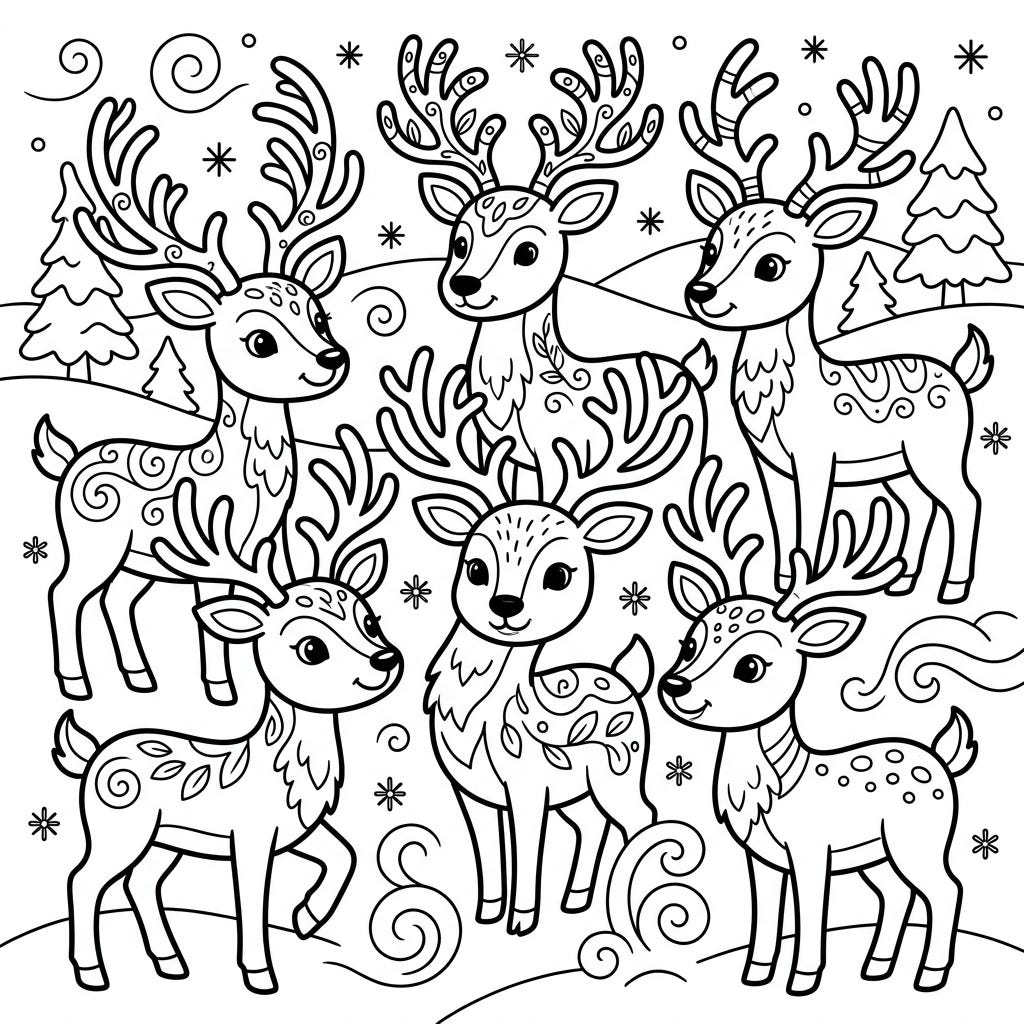 Dive into a whimsical winter wonderland with this enchanting coloring page featuring a joyful herd of reindeer. Perfect for young artists, it offers a delightful opportunity to bring festive scenes to life with a splash of color.
