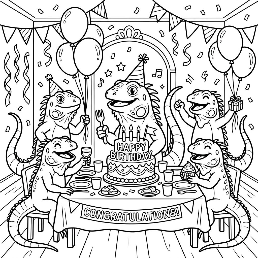 Get ready to celebrate with a super fun reptile party! This delightful coloring page features a group of happy iguanas enjoying a festive birthday with cake, balloons, and plenty of party cheer.