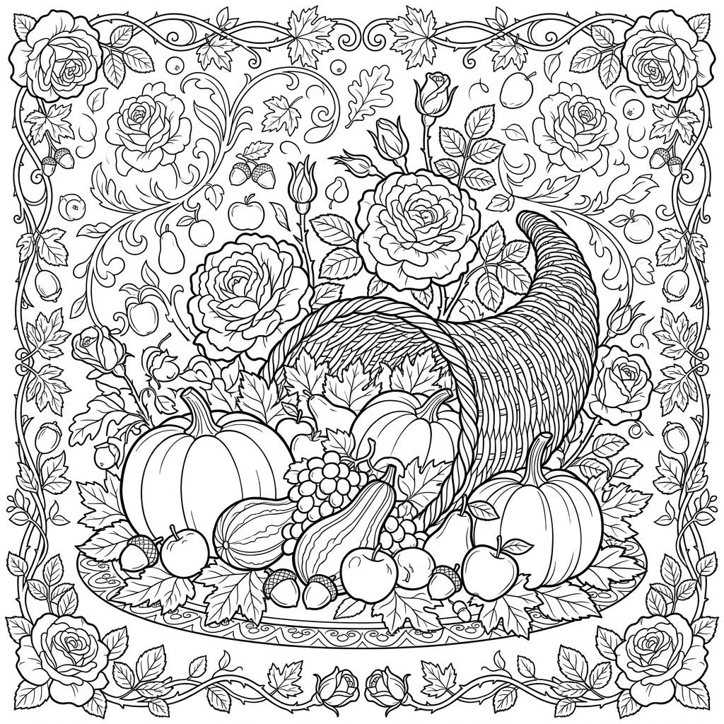 Celebrate the spirit of gratitude with this exquisite Thanksgiving coloring page, blending bountiful harvest elements with the timeless beauty of Damask roses. Discover a cornucopia overflowing with pumpkins, gourds, and fruits, set against a backdrop of intricate floral patterns, perfect for a relaxing coloring session.