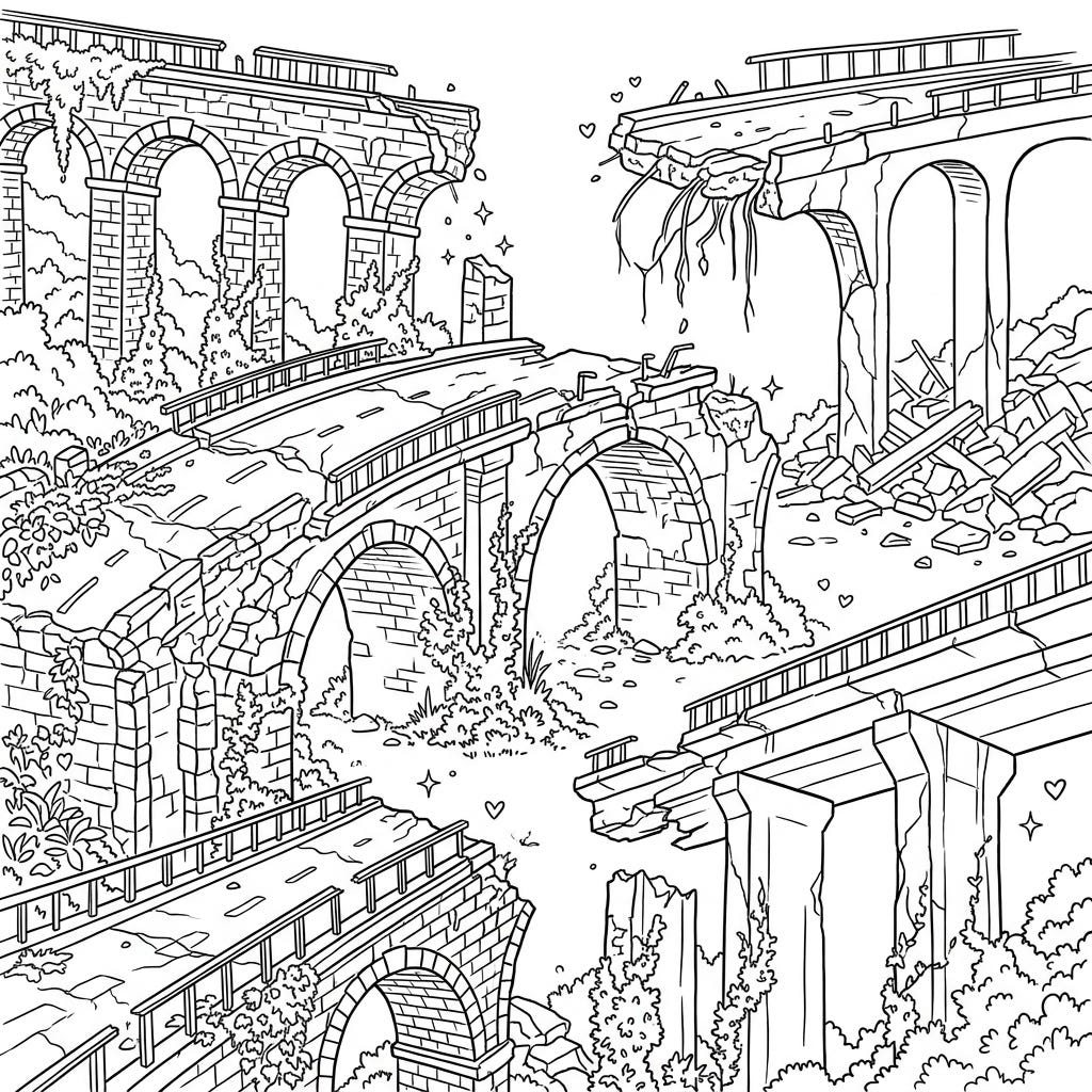 Explore the captivating world of Bridge & Aqueduct Ruins through our extensive collection of coloring pages. These intricate designs feature the majestic remnants of ancient engineering, from Roman aqueducts to medieval bridges, showcasing their weathered beauty and the passage of time. Discover scenes with crumbling arches, overgrown vegetation, and the interplay of water and stone, each telling a silent story of history.