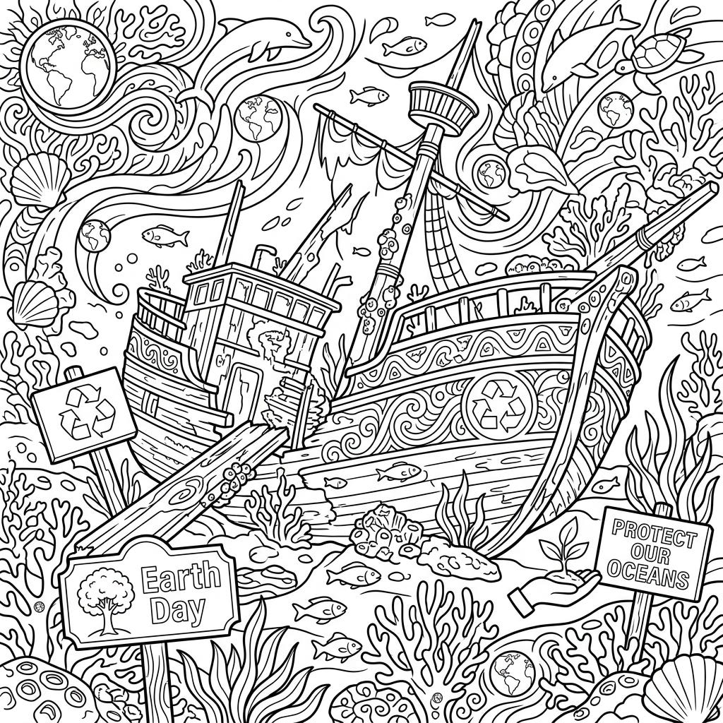 Explore a mesmerizing underwater world with this Earth Day shipwreck coloring page, blending maritime mystery with vital environmental messages. Perfect for inspiring creativity while promoting ocean conservation.