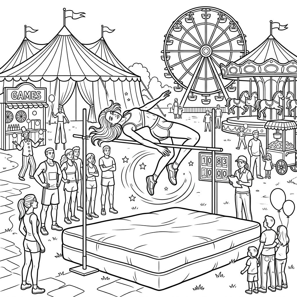 View coloring pageExperience the excitement of sports meeting the magic of the fair with this unique coloring page. A skilled high jumper soars above the bar, surrounded by the vibrant chaos and joy of a bustling carnival.
