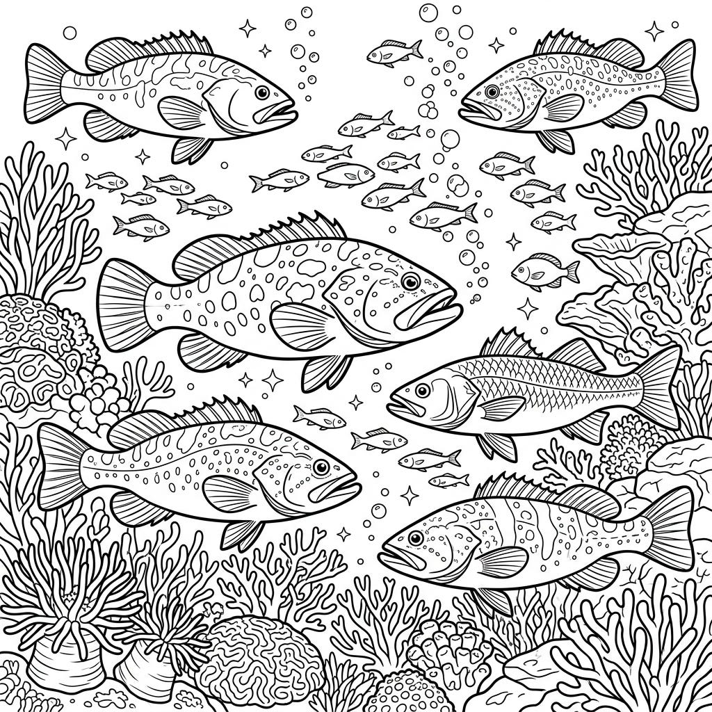 Explore the wonders of the ocean with this detailed coloring page featuring majestic Groupers and Sea Bass. This intricate underwater scene invites colorists of all ages to bring marine life to vibrant life.