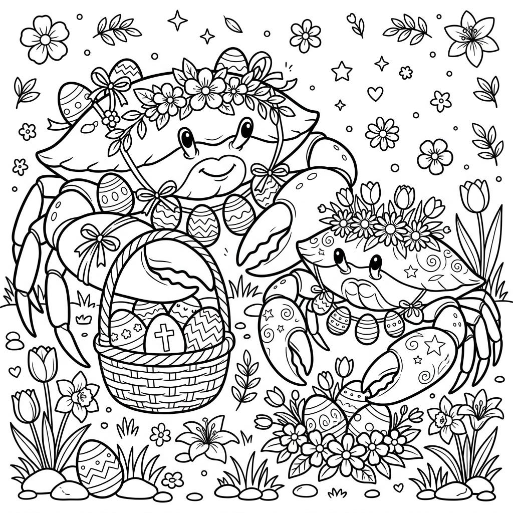Celebrate Easter with an unexpected and utterly charming duo: our Crustacean Colossi! This delightful coloring page features two friendly crabs adorned with spring flowers and surrounded by beautifully decorated Easter eggs, ready for your creative touch.