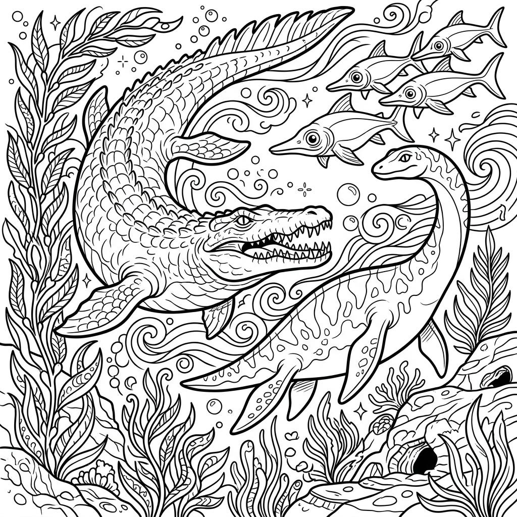 View coloring pageExplore the mysterious depths of a prehistoric ocean with this captivating coloring page featuring gigantic marine beasts. Bring to life majestic mosasaurs, elegant plesiosaurs, and a school of ancient fish with your favorite colors.