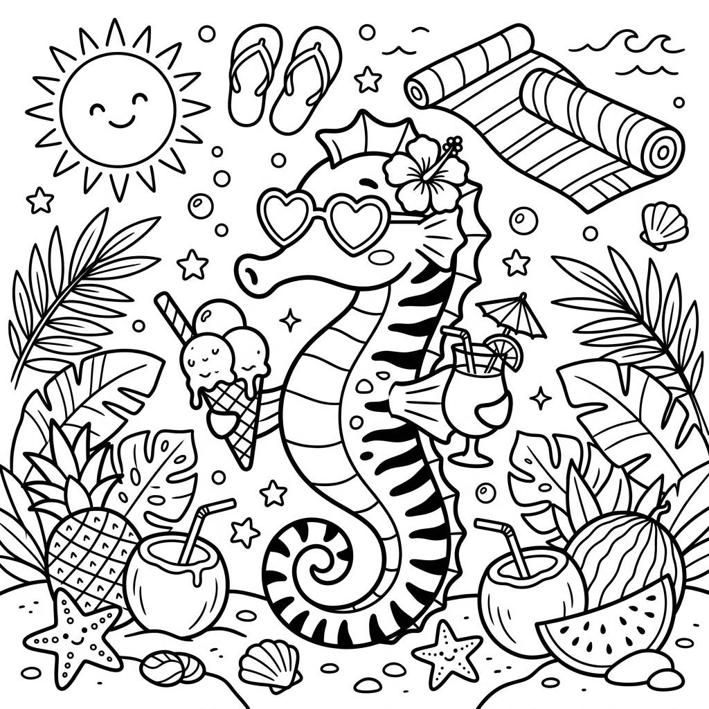 Get ready for a vibrant summer getaway with this delightful coloring page featuring a cool Tiger Tail Seahorse. It's packed with all your favorite beach elements, perfect for a relaxing coloring session.