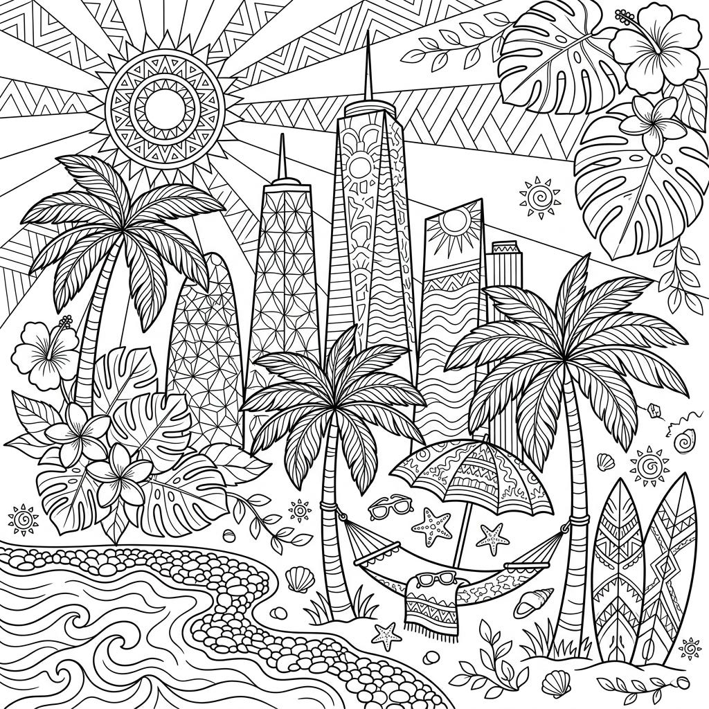 Discover a unique blend of towering tapered skyscrapers and a vibrant summer beach scene in this captivating coloring page. Perfect for adults, it offers intricate details of city architecture mixed with tropical paradise for a relaxing escape.