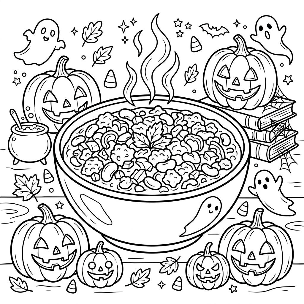 Get into the festive spirit with this delightful Halloween chili coloring page, designed with seniors in mind. Enjoy a cozy scene filled with grinning pumpkins, friendly ghosts, and a steaming bowl of delicious chili.