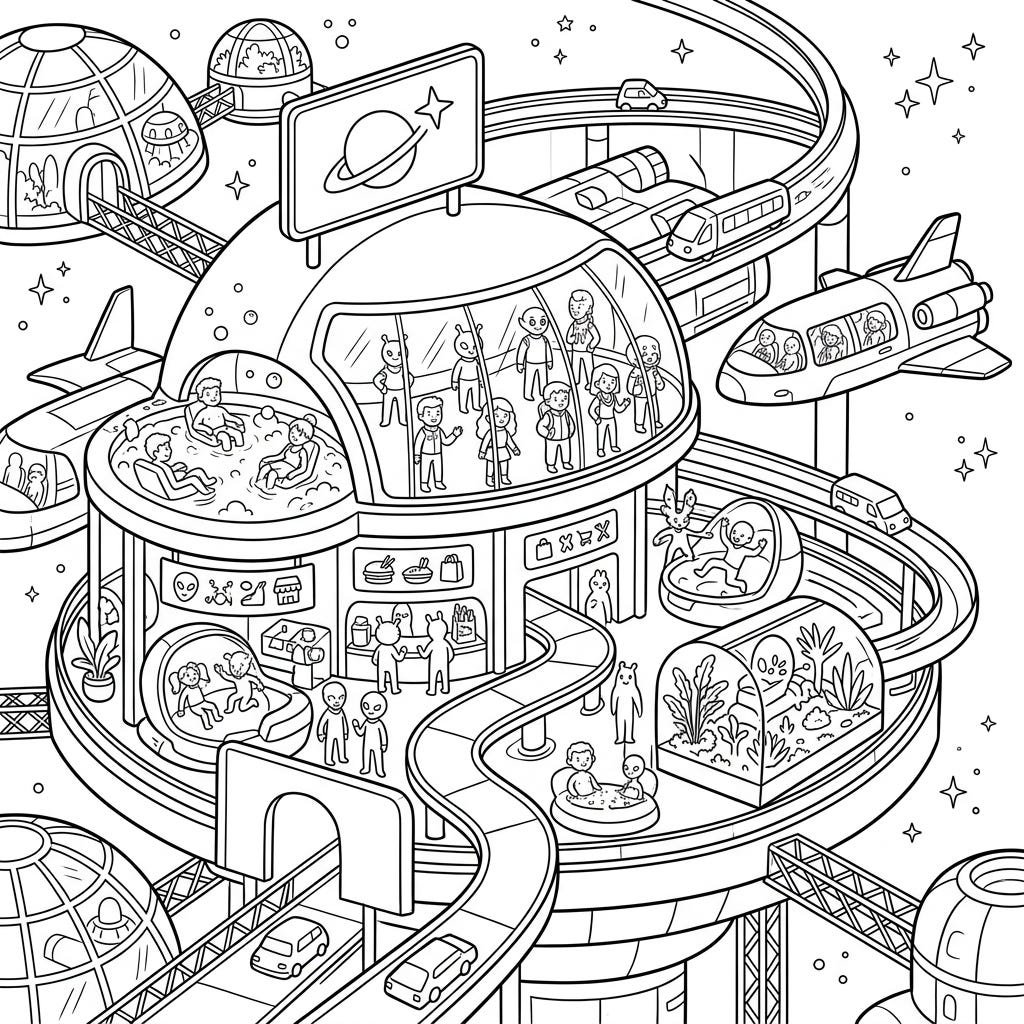 View coloring pageStep into the future with our collection of tourist space resorts coloring pages. Imagine luxurious hotels orbiting distant planets or lavish lunar getaways as you bring these futuristic scenes to life.