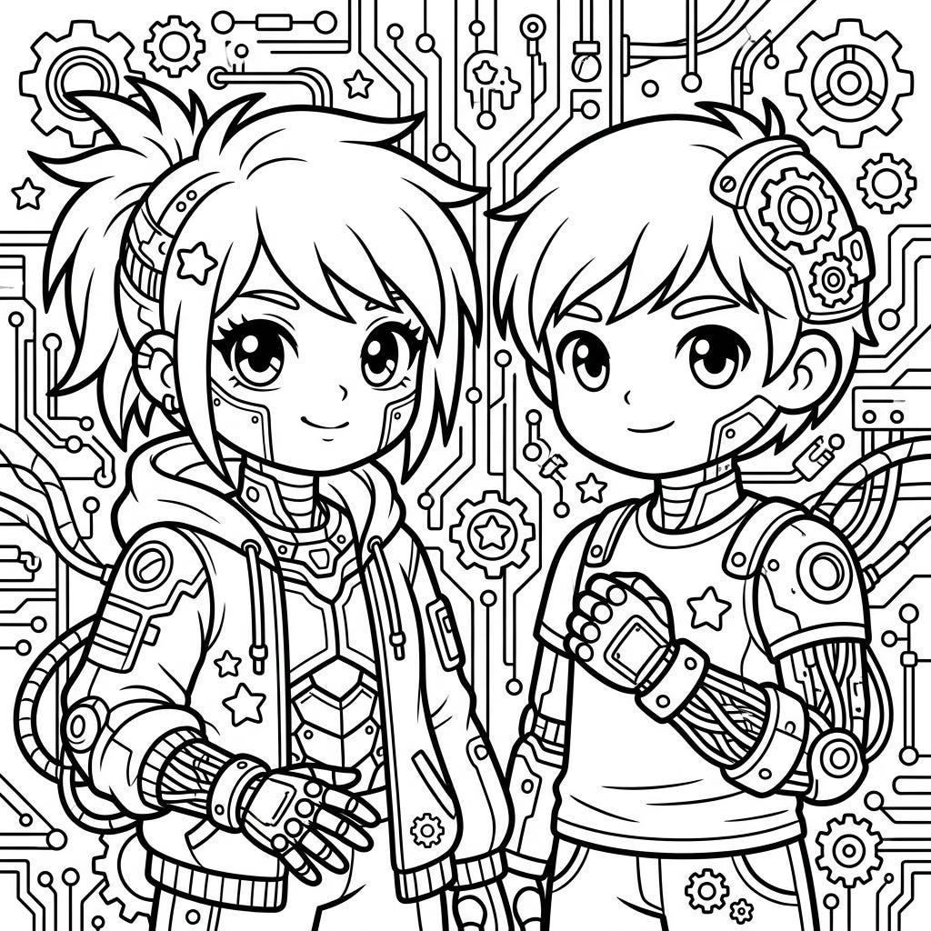 Journey to a world where cute meets tech with our exclusive Kawaii Cyborgs coloring page. Designed for teens, this engaging illustration features two charming robot characters amidst an intricate digital landscape, ready for your artistic touch.
