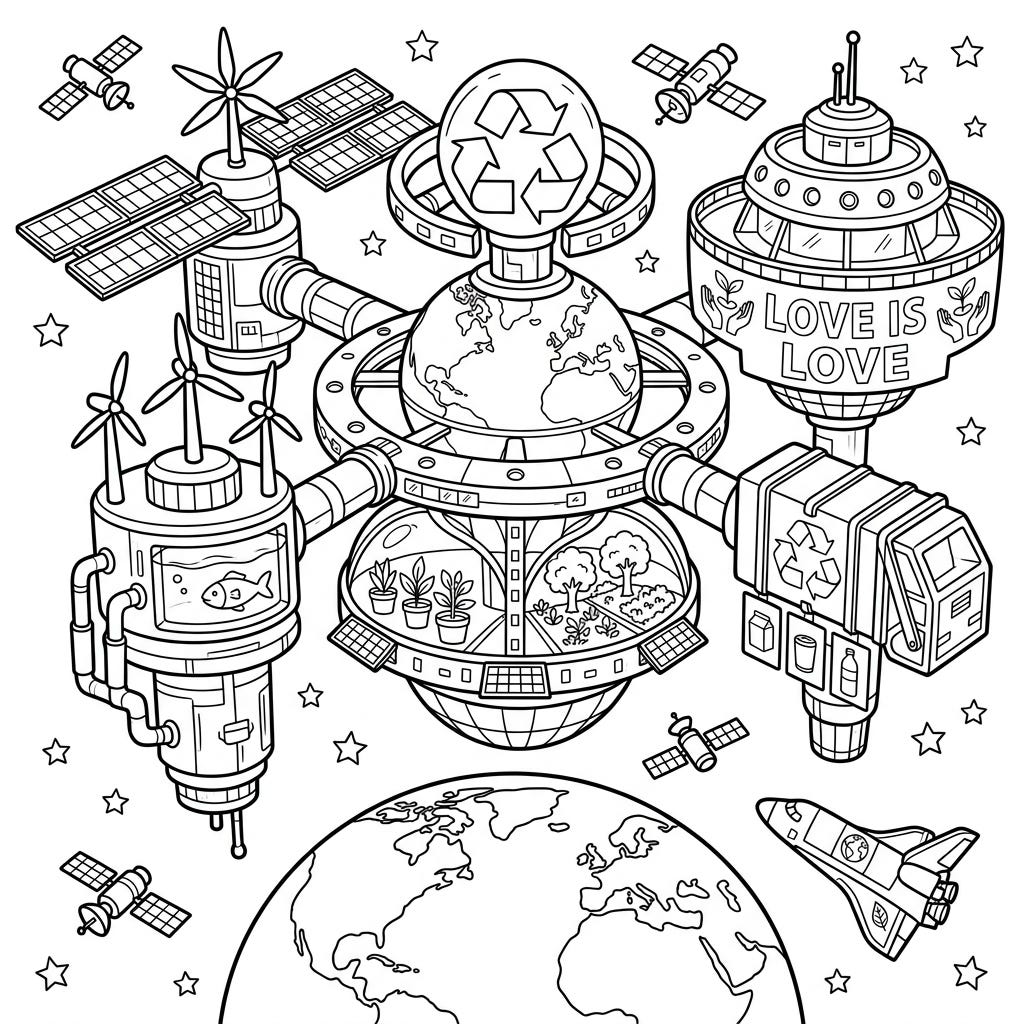 Blast off into an Earth Day celebration with this unique space station coloring page. Explore futuristic habitats designed for sustainability, featuring recycling, gardens, and symbols of global care as you color.