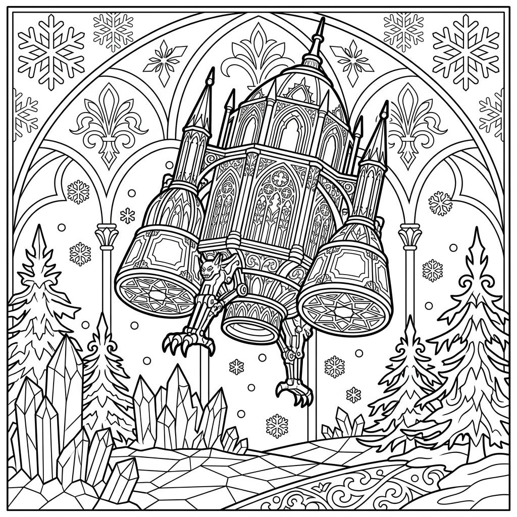 View coloring pageDiscover a truly unique coloring experience with this intricate Gothic Victorian lander, gracefully traversing a magical winter landscape. Its detailed design, combined with a snowy backdrop, offers hours of creative enjoyment for colorists.