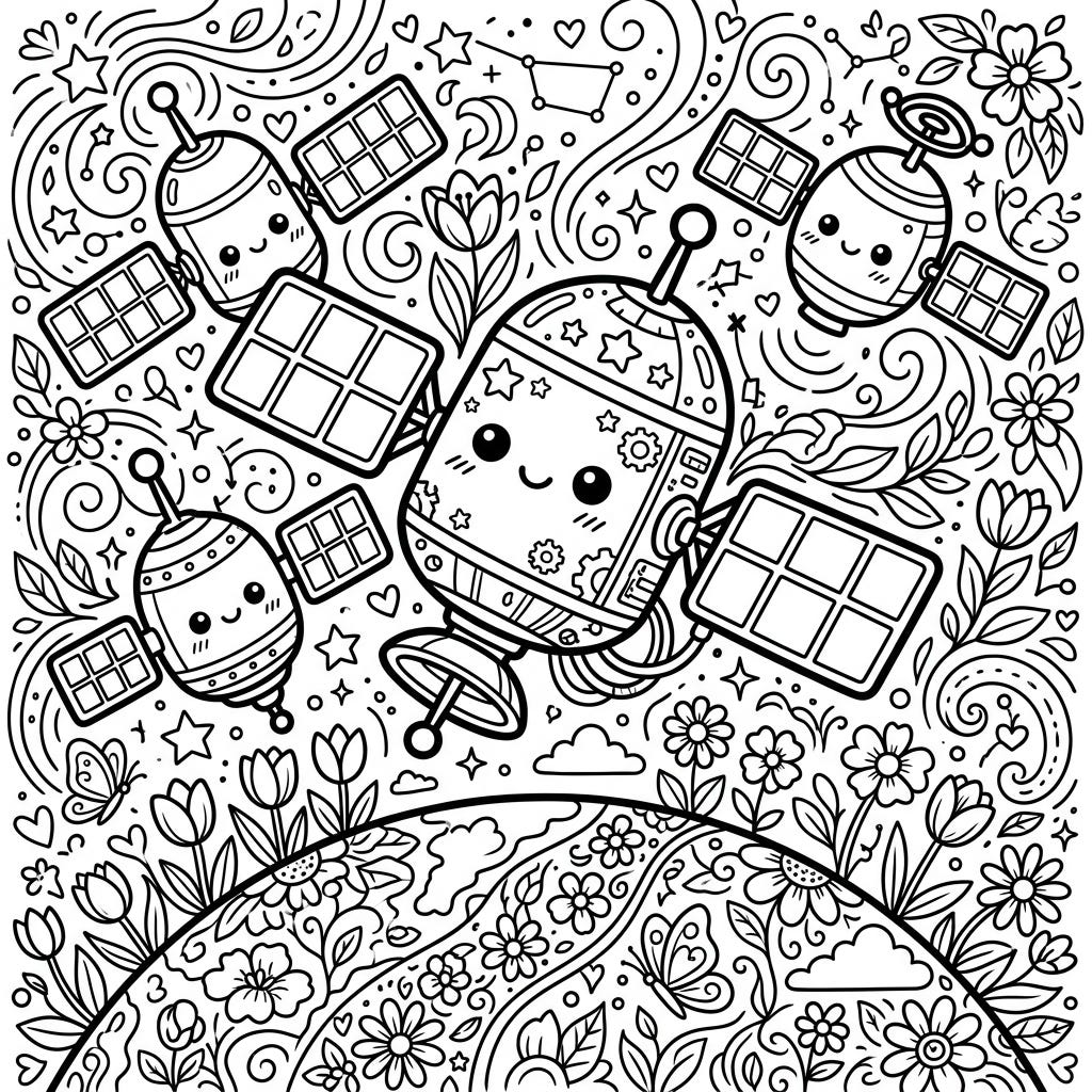 View coloring pageGet ready for an out-of-this-world coloring adventure with our adorable Kawaii satellites! This delightful page blends futuristic fun with the fresh beauty of a blooming spring garden, perfect for a joyful artistic escape.