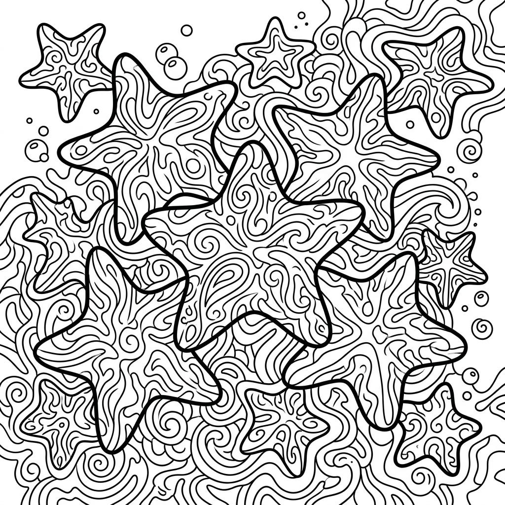 View coloring pageImmerse yourself in a mesmerizing world with this psychedelic cushion stars coloring page. Featuring robust cushion stars amidst a captivating swirl of patterns, it's an intricate journey into abstract ocean beauty.