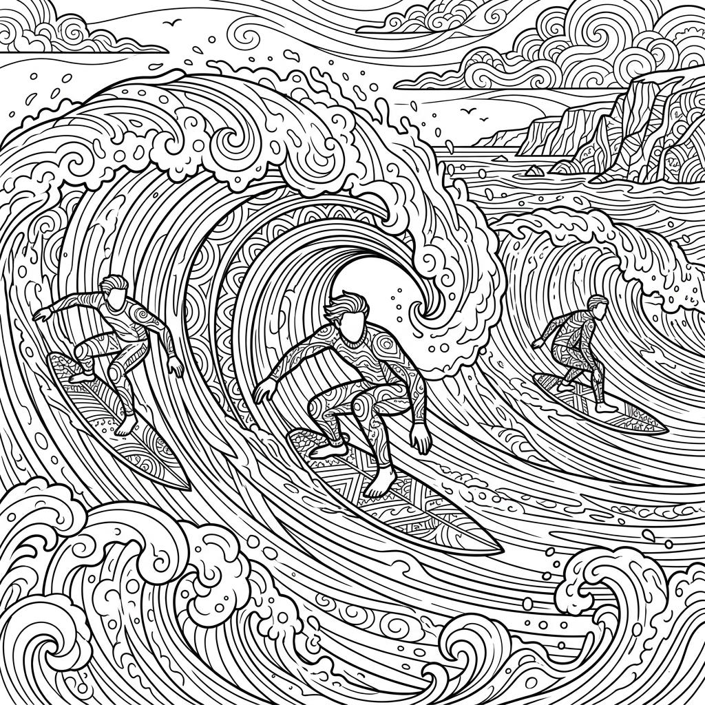 Experience the thrill of the ocean with this intricate adult coloring page featuring powerful big wave surfers. Dive into a detailed scene that promises hours of creative relaxation.