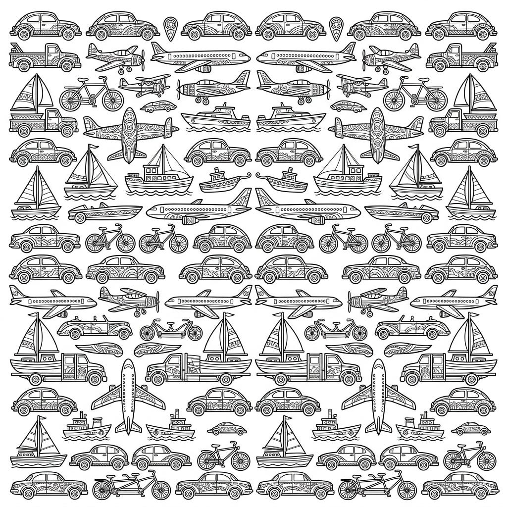 Dive into a mesmerizing world of transportation with this unique coloring page featuring intricate vehicle grid patterns. Discover cars, airplanes, boats, and bicycles adorned with detailed designs, ready for your creative touch.