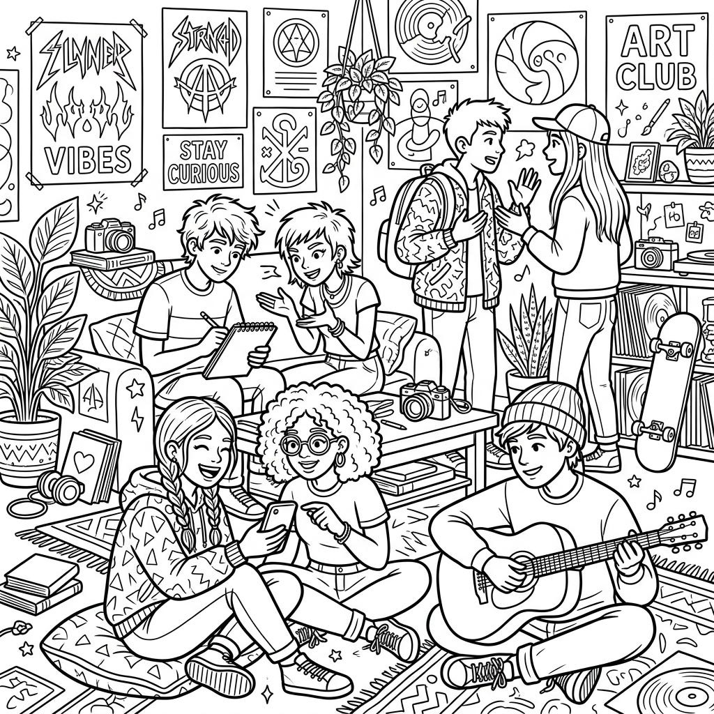 Capture the essence of friendship and creativity with this vibrant coloring page featuring a group of diverse teenage friends. Explore a detailed scene brimming with artistic expression, music, and shared moments.