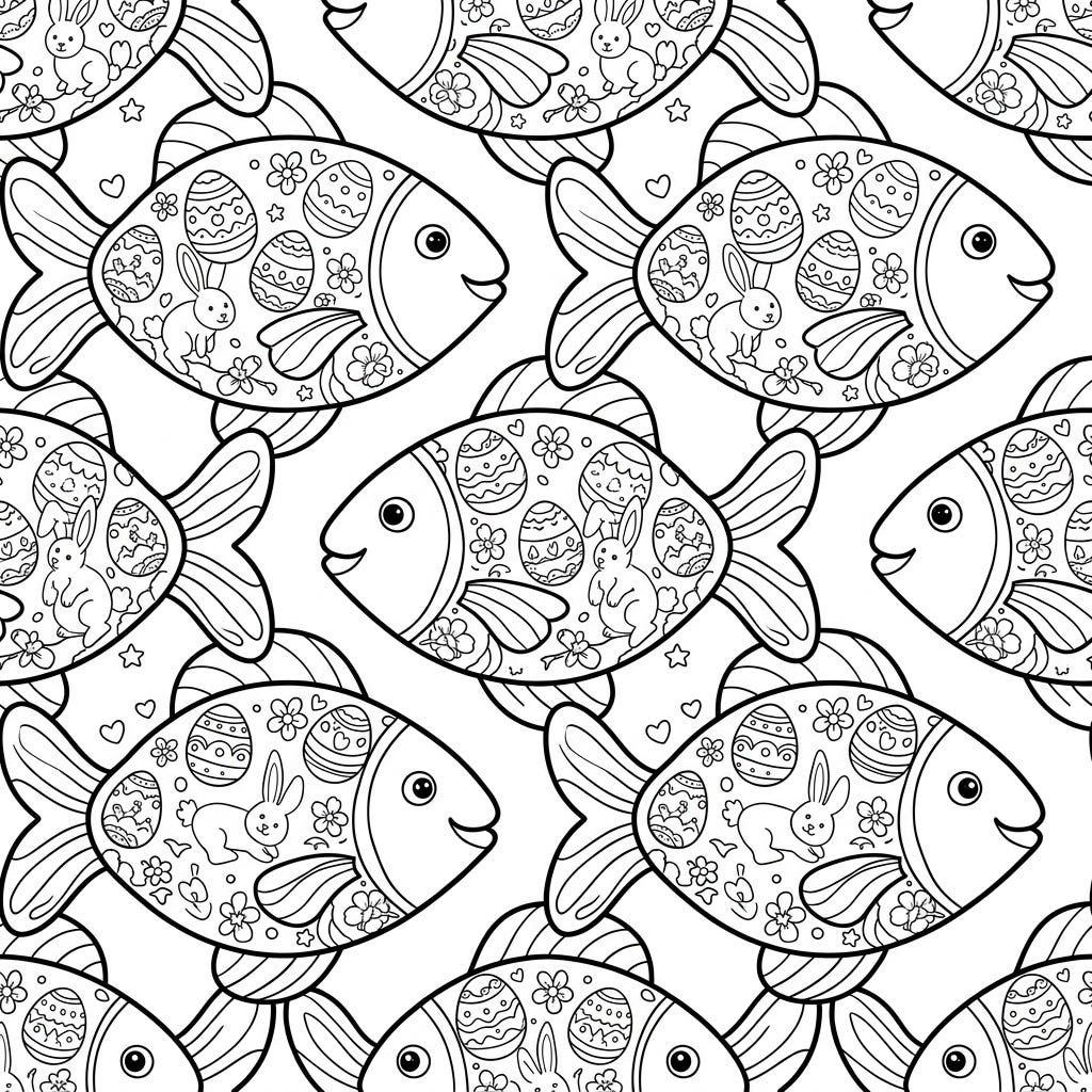 Dive into a sea of Easter cheer with this charming fish tessellation coloring page, featuring festive bunnies, decorated eggs, and spring blossoms. It's a delightful and unique pattern, perfect for adding a splash of holiday creativity to your day.