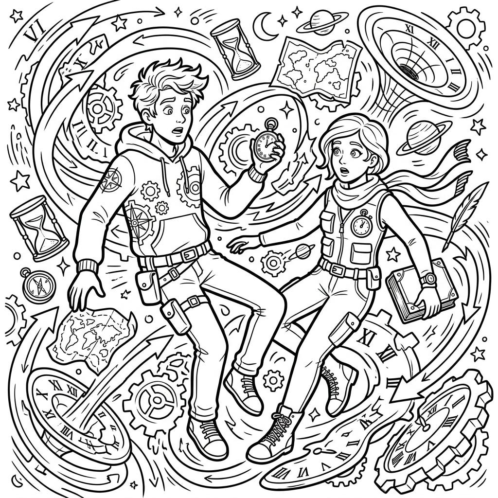 Dive into an extraordinary adventure with our Accidental Chrononauts coloring page, featuring two young explorers caught in a whirlwind of time. This intricate design invites you to bring their unexpected journey to life with your favorite colors.