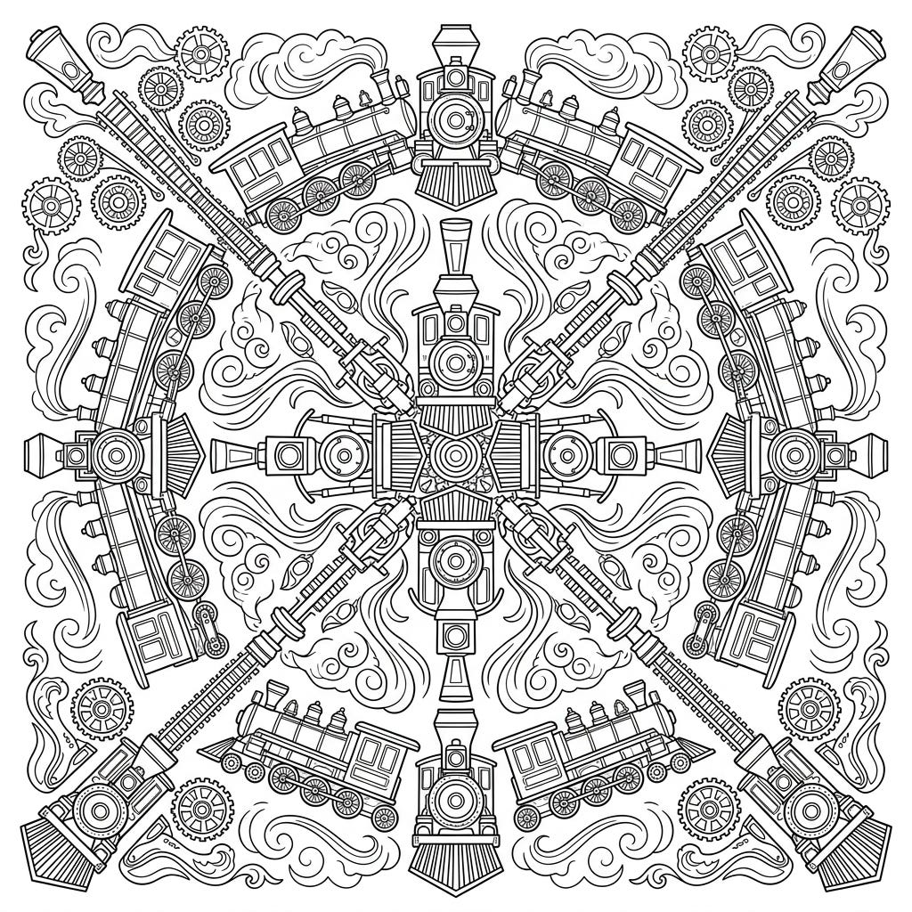Embark on a captivating coloring journey with this unique steam train mandala, blending industrial heritage with intricate symmetrical artistry. Discover the joy of bringing these powerful locomotives to life within a mesmerizing radial design.