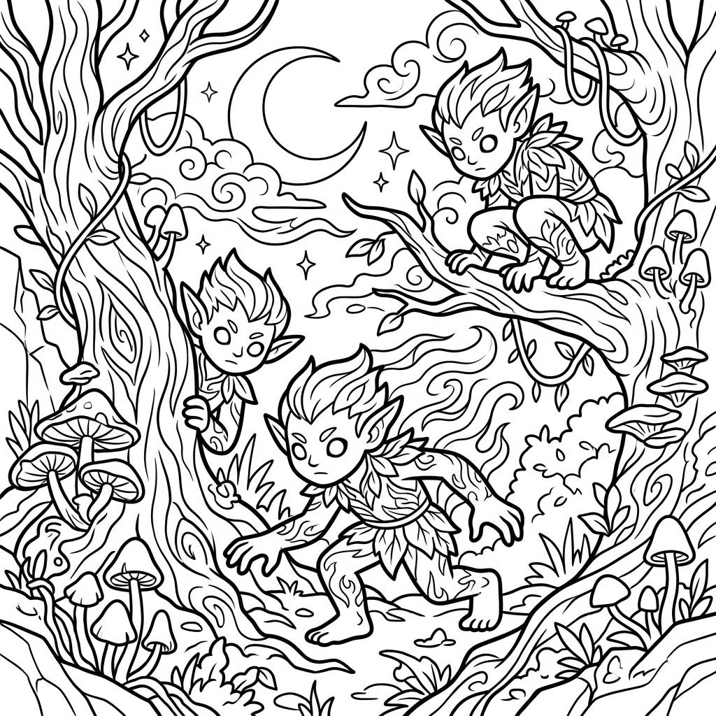 View coloring pageEnter a world of enchantment with this captivating full-scene coloring page featuring elusive shadow trolls. Discover hidden details within a mysterious forest landscape, ready for your creative touch.