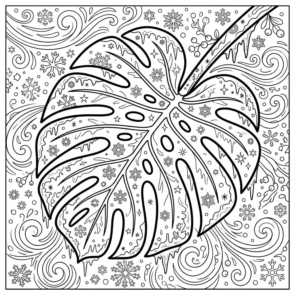 Dive into a unique winter scene with this beautiful Monstera Leaf coloring page, intricately designed with frosty details and delicate snowflakes. Perfect for a cozy coloring session, it blends tropical charm with the serene beauty of a winter wonderland.