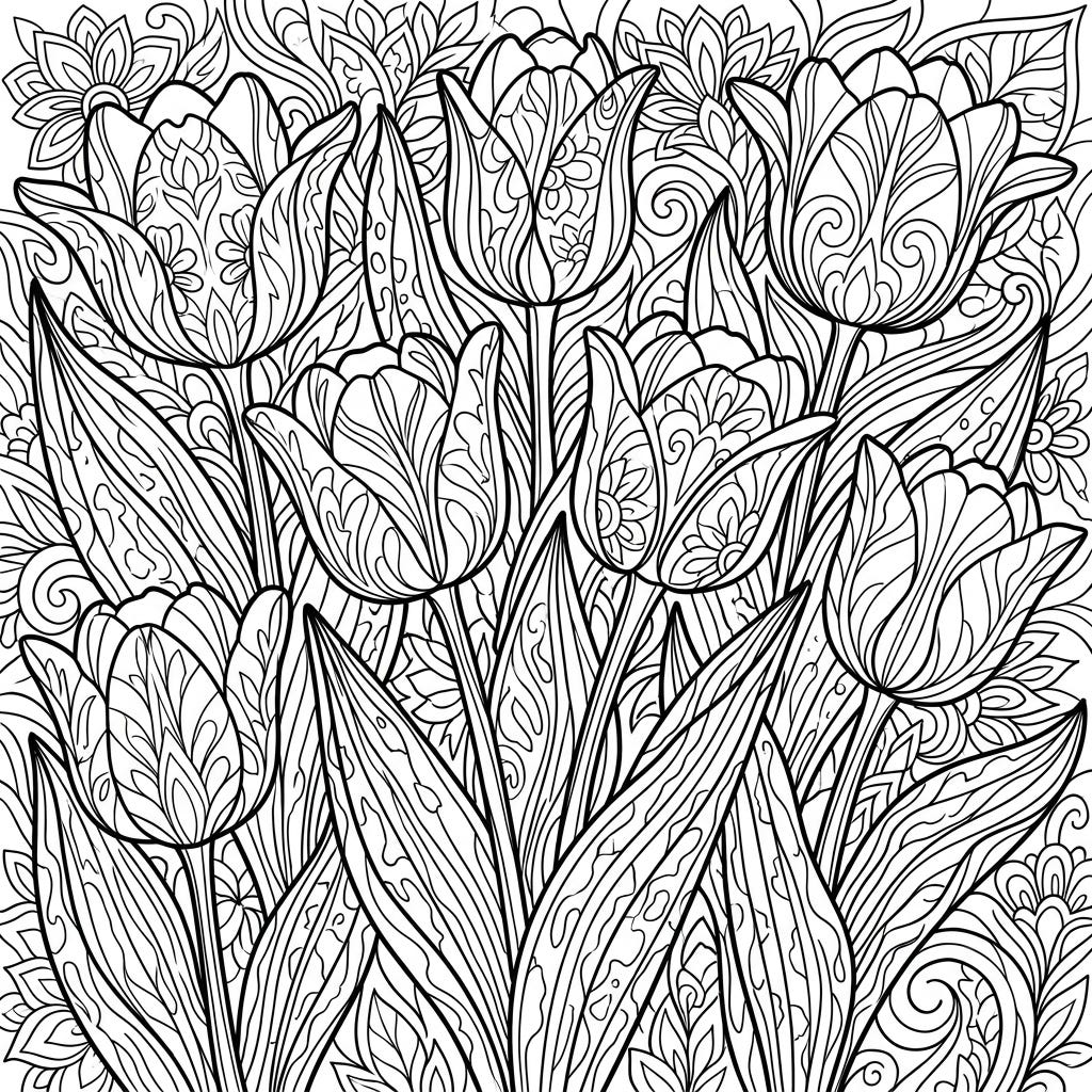 Dive into the beauty of spring with this stunning Greigii Tulips coloring page. Featuring intricate floral patterns and lush leaves, it's a perfect canvas for your artistic expression.