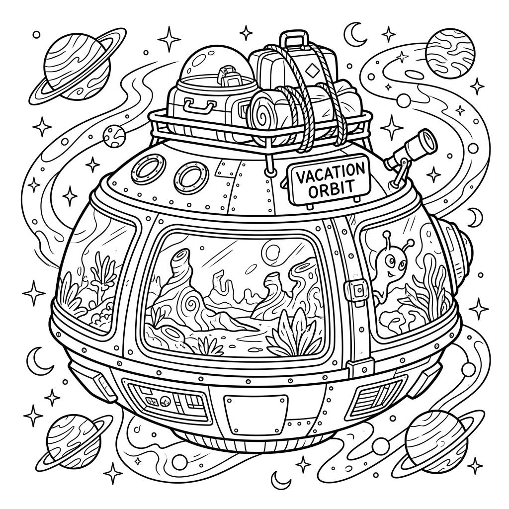 This imaginative coloring page features a spacecraft packed for an exciting cosmic vacation. Discover alien worlds and starry skies as you bring this interstellar adventure to vibrant life.