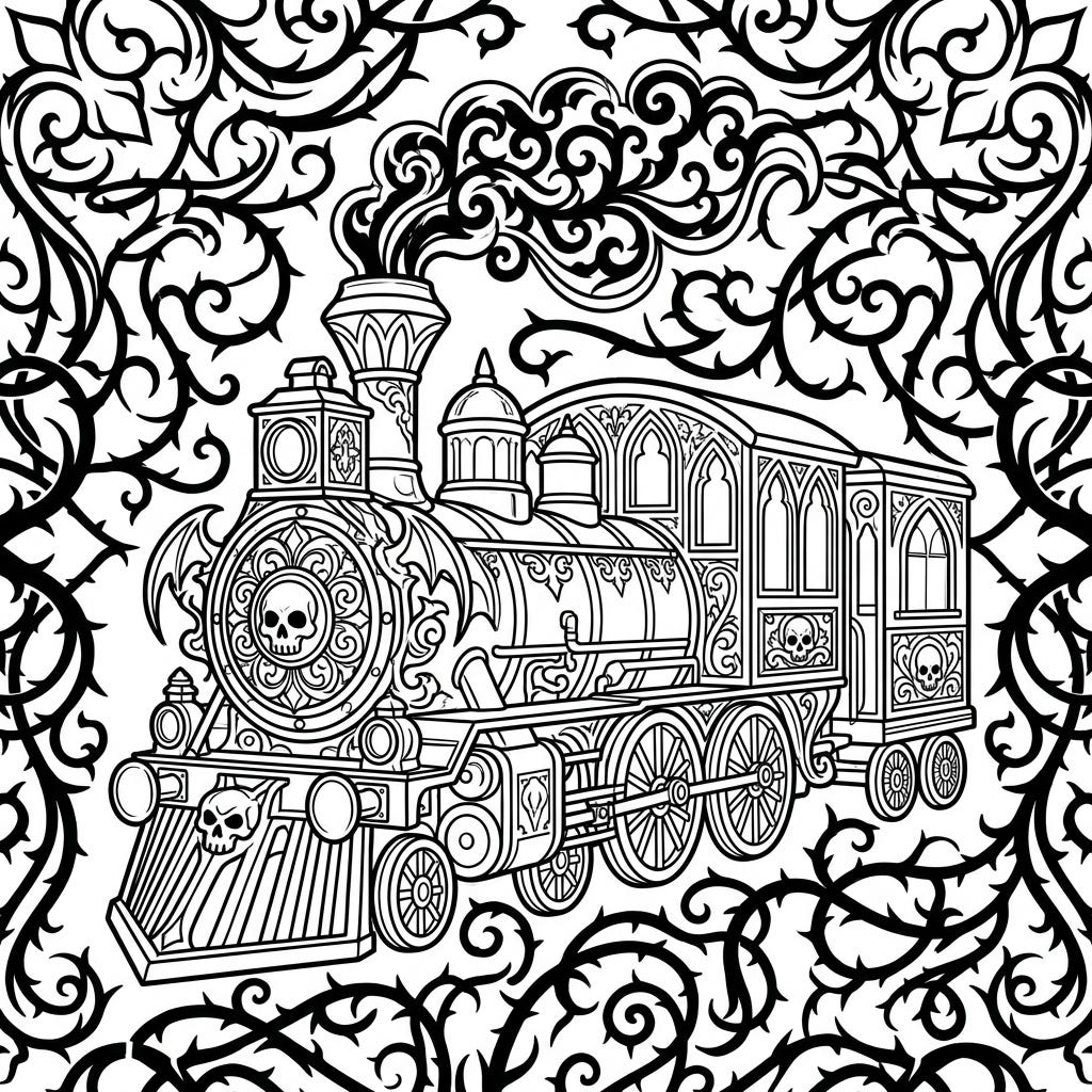 Journey into a world of dark elegance with this intricate Gothic train coloring page, designed perfectly as a bookmark. Adorned with skulls, ornate details, and swirling thorny vines, it offers a captivating and unique coloring experience.