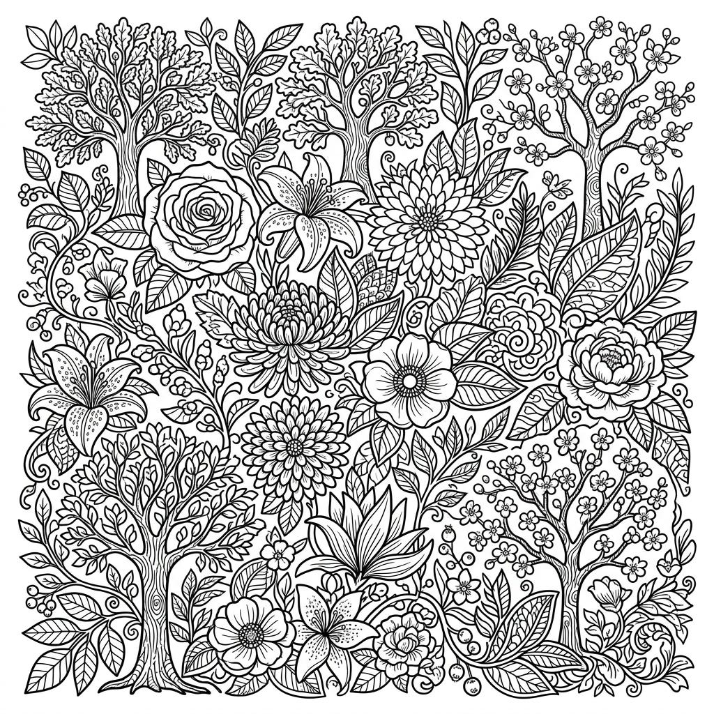 Immerse yourself in nature with this stunning botanical adult coloring page. Discover a dense tapestry of intricate flowers, lush leaves, and elegant trees, ready for your creative touch.