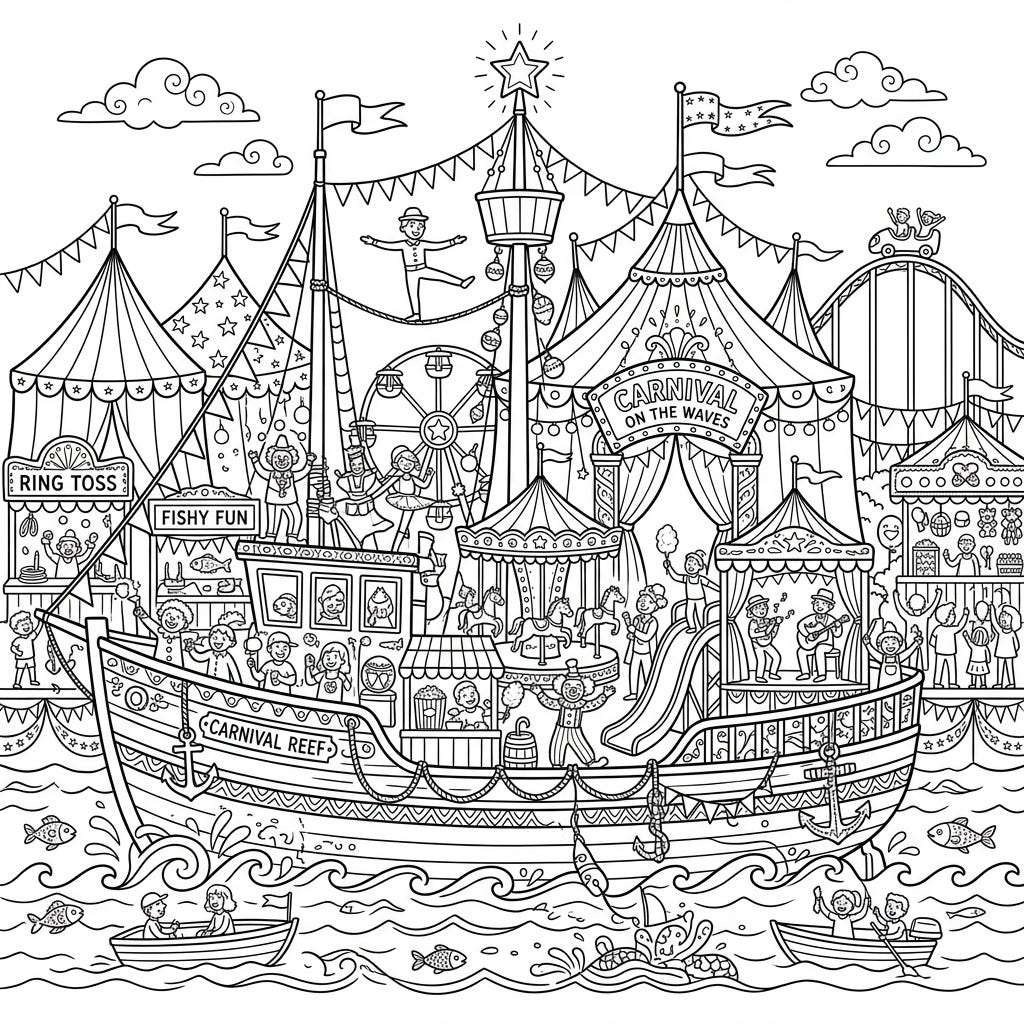 Set sail for adventure with this extraordinary coloring page, where a sturdy fishing boat transforms into a bustling carnival afloat on the waves. Discover a world of circus tents, thrilling rides, and happy fairgoers waiting for your creative touch.