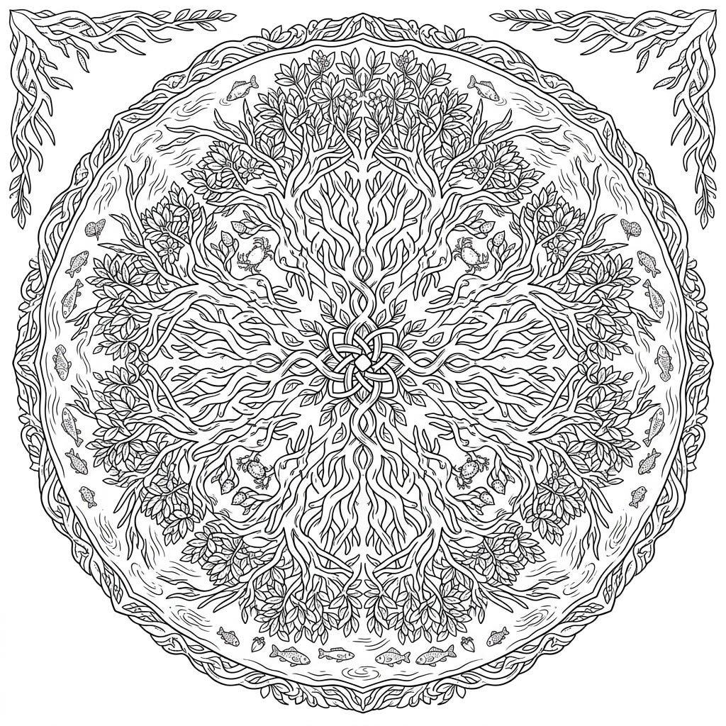 Unleash your creativity with this breathtaking coloring page featuring a detailed mangrove forest arranged as a beautiful mandala. This unique design intricately weaves together the delicate roots, lush foliage, and diverse wildlife of the mangrove ecosystem for a truly immersive coloring experience.