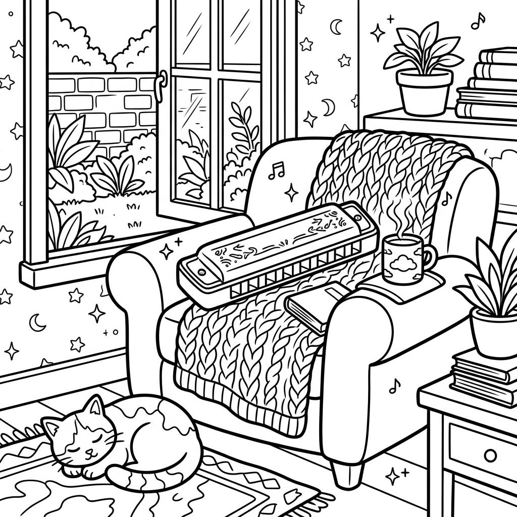 Unwind with this delightful coloring page featuring a harmonica in a tranquil, cozy setting. Perfect for embracing relaxing weekend vibes, this illustration invites you to add your personal touch to every comforting detail.